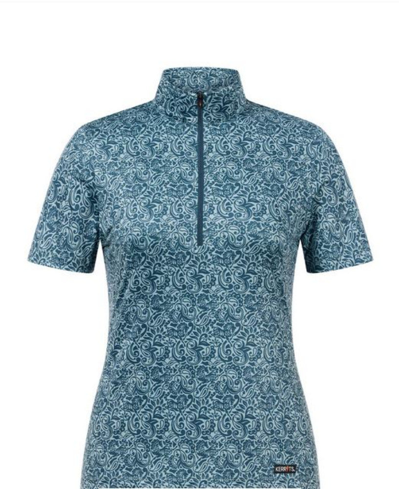 A cooling short sleeve riding top that wicks, breathes and covers for peak summer performance. Coolcore® fabric naturally wicks and disperses sweat, keeping riders cool and dry from warm-up to cool-down. Kerrits-exclusive equestrian prints provide flattering coverage, while cleverly concealing inevitable horse slobber and barn dirt. With UPF+40 sun protection and a ten-inch zip neck for customizable airflow, it’s a go-to for hot days in the saddle.