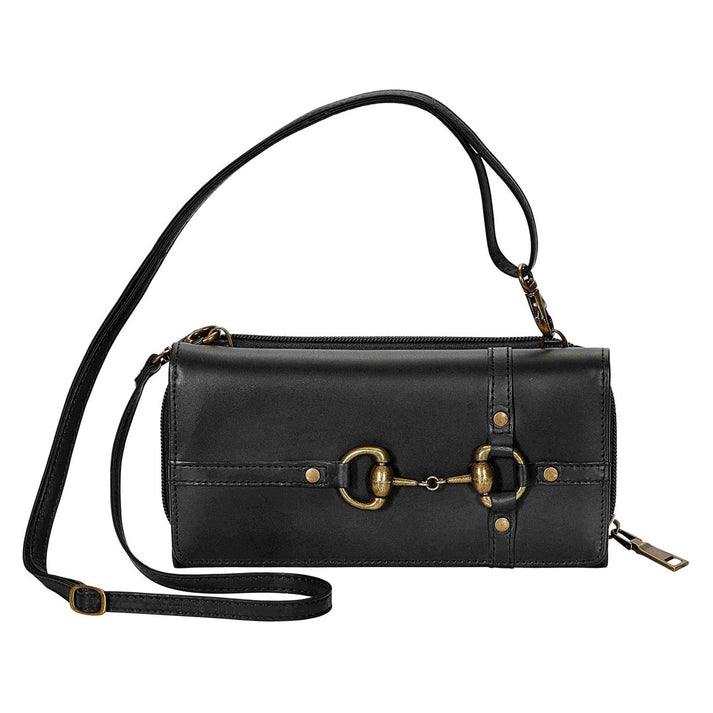 Use this amazing bag 3 ways! Converts from wallet to cross-body bag to clutch. Genuine leather with equestrian snaffle bit embellishment. 3-fold design with magnetic top flap closure. Interior has 12 credit card slots, bill fold slide pockets, and clear window slide for license. Slide out 6" wrist band for clutch wallet use. Gusseted back zip pocked for coins or cell phone. Removable, adjustable crossbody strap up to 56".