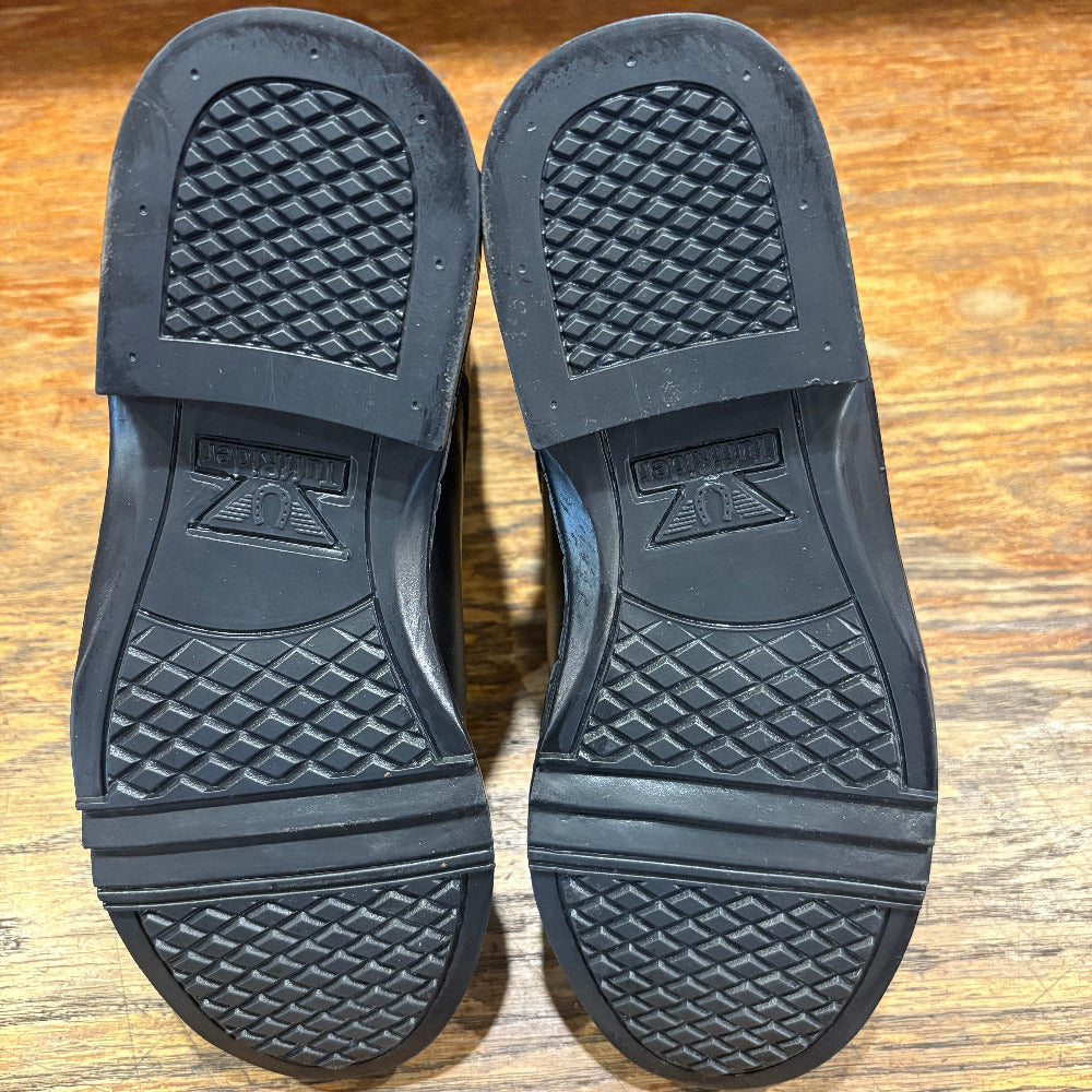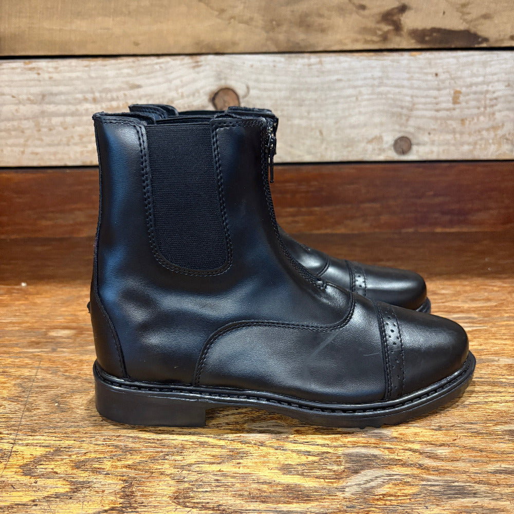 TuffRider provides you with these durable and water-resistant boots to let a rider complete her look. These Starter Paddock Boots are perfect to protect your feet from getting dirty and wet. Include must-have features like spur rests to get quicker reactions from your horse and elastic side gussets for better fitting. The upper is constructed with synthetic leather material to help protect these boots from daily wear and tear, making them an ideal choice for everyday usage. Rubber outsole helps provide enhanced support to your feet while walking and riding. Punched toe caps and stitched detailing add a touch of style to these paddock boots.