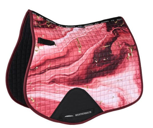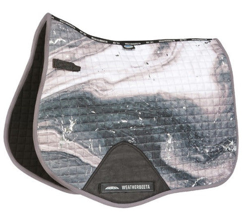 The WeatherBeeta Prime saddle pads offer high quality design and technology for your horses comfort. The WeatherBeeta Prime Marble Shimmer All Purpose Saddle Pad is a durable cotton pad with a polyester wick easy lining helping to keep your horse cool, dry and comfortable. The breathable mesh spine allows extra airflow to the horse's back. The covered girth patch offers durability and the touch tape girth loops allow for a versatile fit. Easy attachment to the D-rings is made simple with short touch tape loops for a secure fit and the high wither design allows for extra space to assure maximum comfort for the horse. Gentle machine or hand wash at a low temperature, air dry, do not tumble dry. Matching range available.