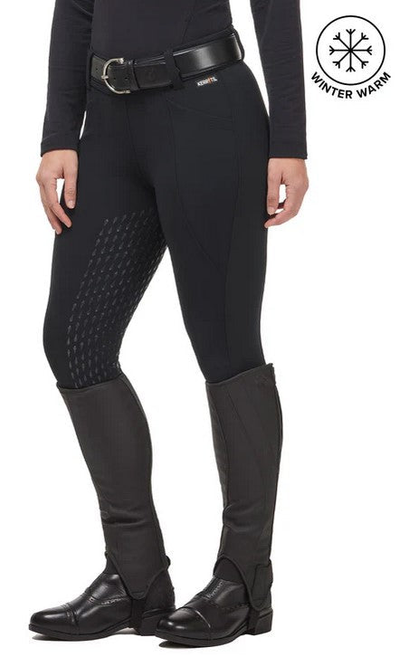 These lightweight winter tights keep riders comfy in the shoulder seasons while the shades of Kerrits herringbone jacquard pattern keep rides colorful long after the leaves fall. Super-cozy brushed fleece inside is perfect for riding indoors or as a layer outdoors when the temperatures drop. Higher, wide waistband is enhanced by four-way stretch with flattering compression. Two side pockets for treats and phone. GripSoft™ knee patches for a flexible, secure grip.
